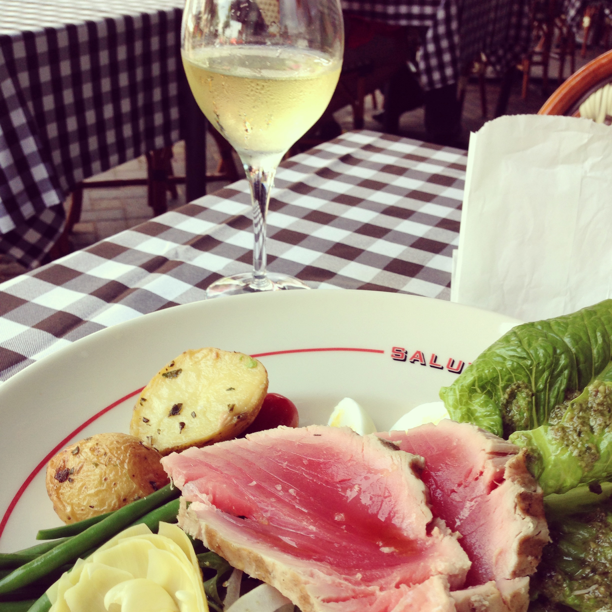 I took a break for a bite to eat and something to sip on down the street at Salut.  It was a bit swelter-y with no breeze outside but I chose to sit on the patio of this quaint French- American bistro any way.  On my plate- Ahi Tuna Nicoise salad, so yummy and it was beautifully plated.  In my glass- Simi chardonnay, refreshing and crisp.